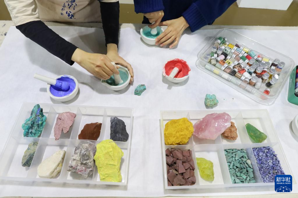 5月11日,学员在位于敦煌市的莫高里工匠村用天然矿石制作颜料。