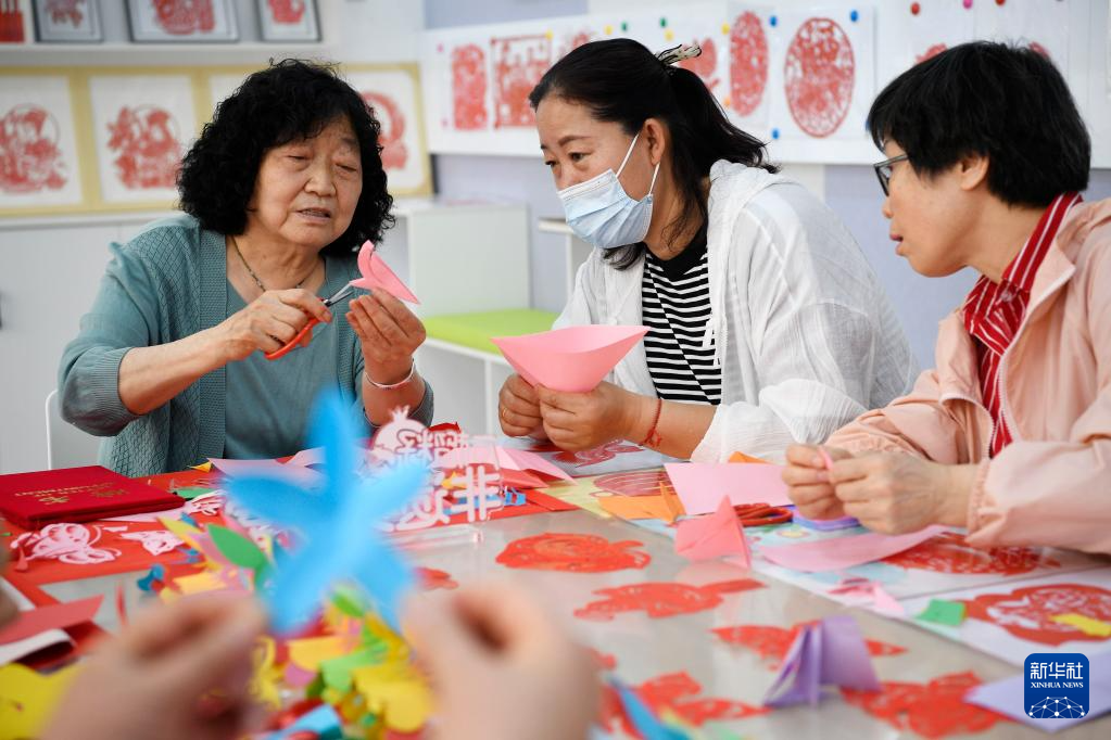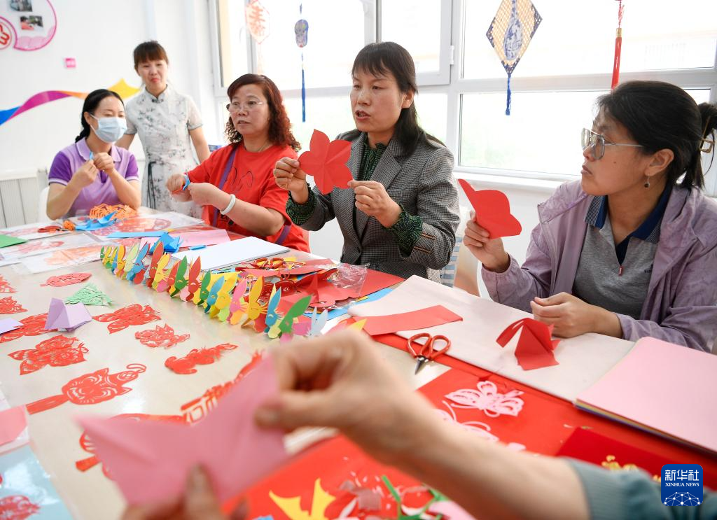 5月17日,老师(左一)向居民传授剪纸技艺。