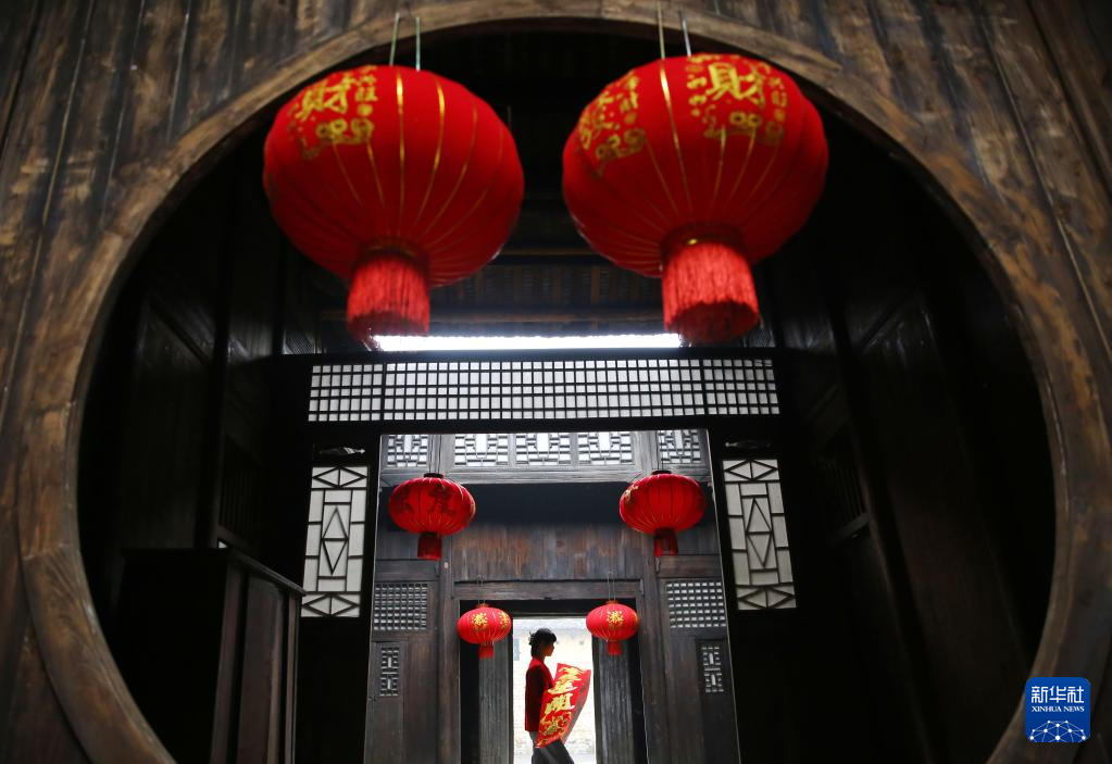 村民在湖南省常宁市中田村古民居内挂灯笼(3月3日摄)。