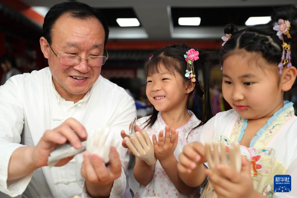 5月21日,在山东青岛,姜玉涛给小朋友展示木偶制作工艺。