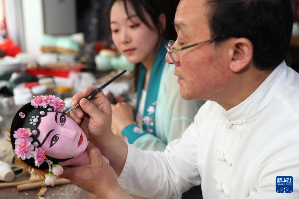 5月21日,在山东青岛,姜玉涛给徒弟教授木偶勾脸技艺。