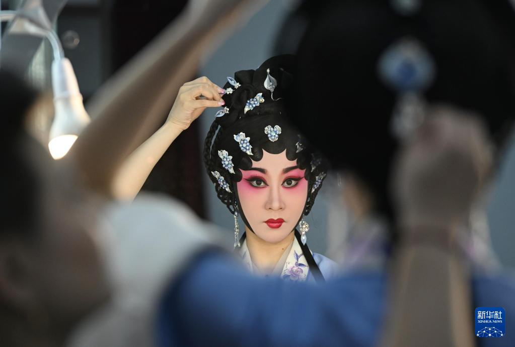 5月29日,广州粤剧院演员在河北梆子剧场演出前化装。