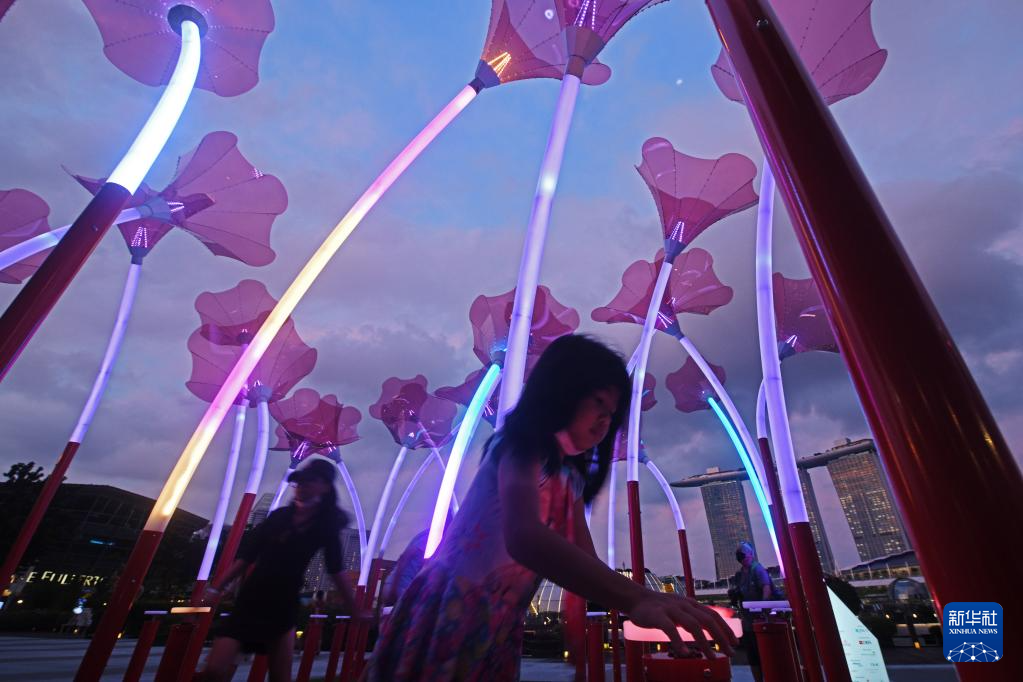 5月30日,市民在新加坡滨海湾观看《照亮新加坡》灯光艺术装置展。
