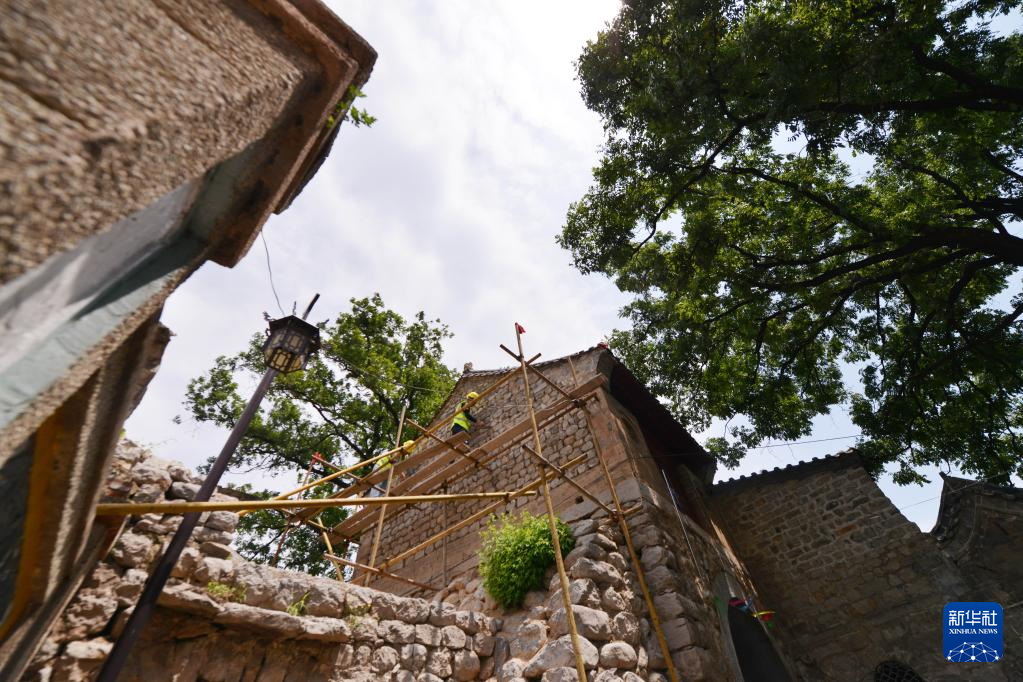 6月7日,施工人员在河北省石家庄市井陉县小梁江村进行民居修缮。