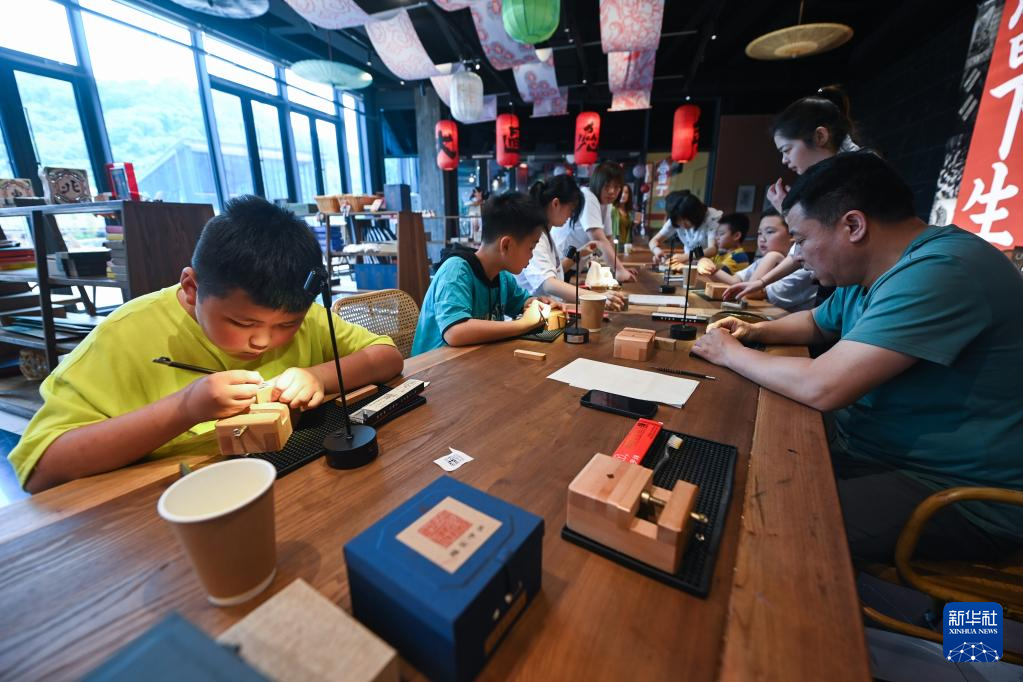在位于杭州临安吴越文化公园内的“地道吴越”民间手工艺文化空间内,孩子们在老师的带领下学习篆刻技艺(5月14日摄)。该文化空间集临安非遗、临安民艺、文创研学、休闲体验为一体,近百件临安民艺产品在这里汇集。