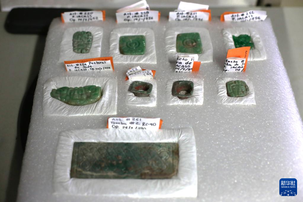 这是6月8日在洪都拉斯科潘玛雅遗址国际考古队仓库内拍摄的由联合考古队发掘出的玉器。新华社发(卢西奥·塔沃拉摄)