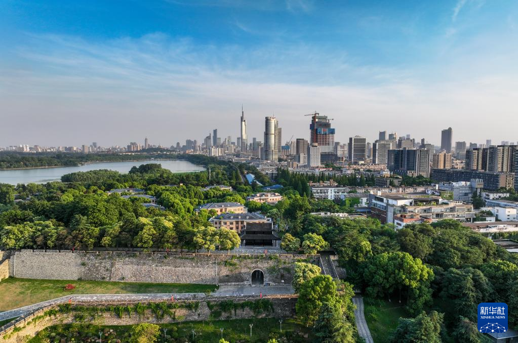 南京明城墙神策门、玄武湖与城市风光(6月9日摄,无人机照片)。