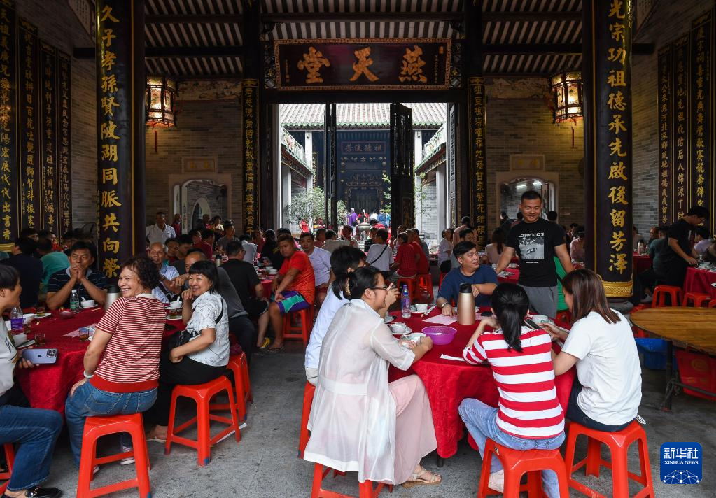 6月15日,2023年车陂龙舟竞渡第一名“范阳简”龙船会在简氏家祠里摆下几十桌龙船饭庆祝。