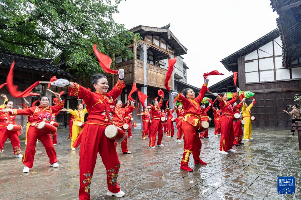 6月21日,在重庆市永川区板桥镇板桥老街,村民进行腰鼓表演。