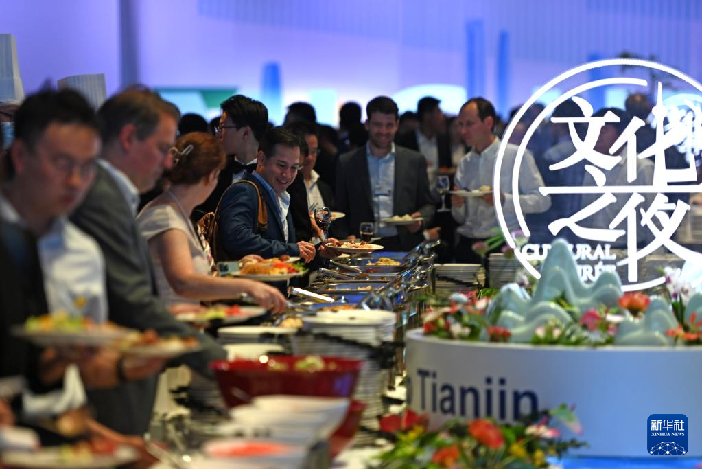 6月27日,与会嘉宾在第十四届夏季达沃斯论坛文化之夜现场了解天津特色美食。