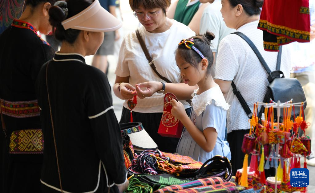 7月8日,游客在五指山三月三广场选购黎族特色产品。