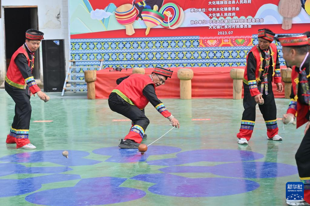 7月11日,在大化瑶族自治县仁良村,村民在陀螺文化展演活动中打陀螺。