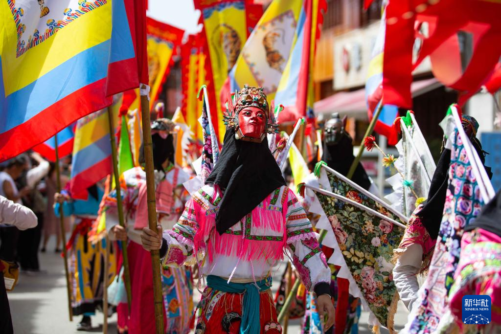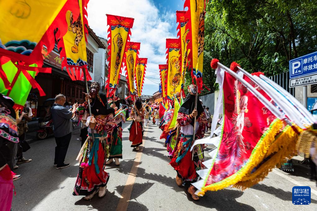 7月15日,地戏艺人在贵州省安顺市西秀区旧州镇开展地戏巡游。