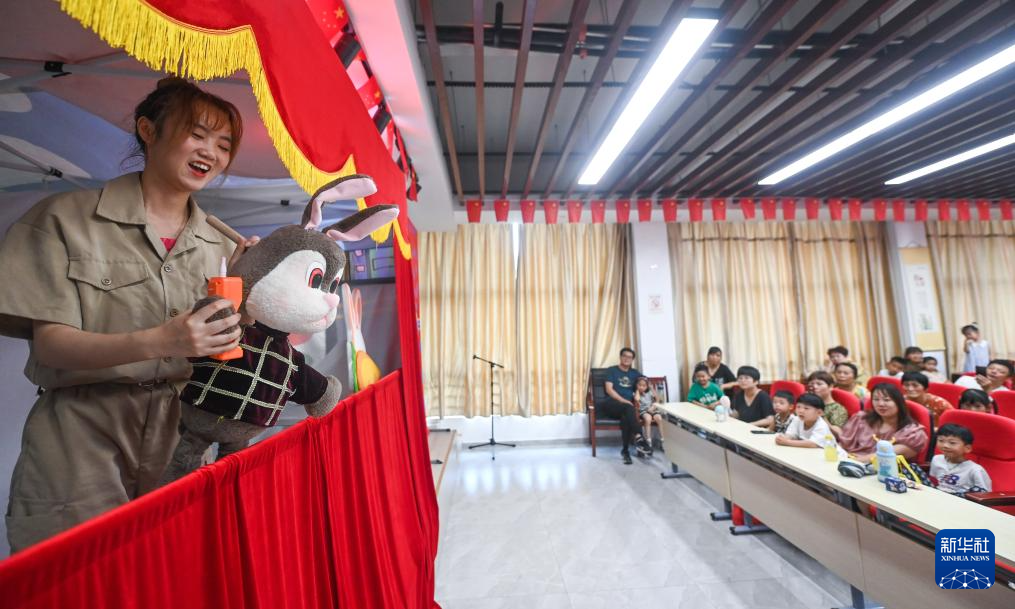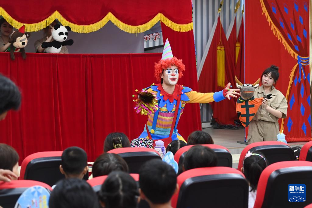7月20日,在嘉兴市秀洲区新塍镇陡门村文化礼堂,秀湖音乐厅小橙堡儿童艺术剧团在演出儿童剧《红鼻头哥哥和小木偶们》。