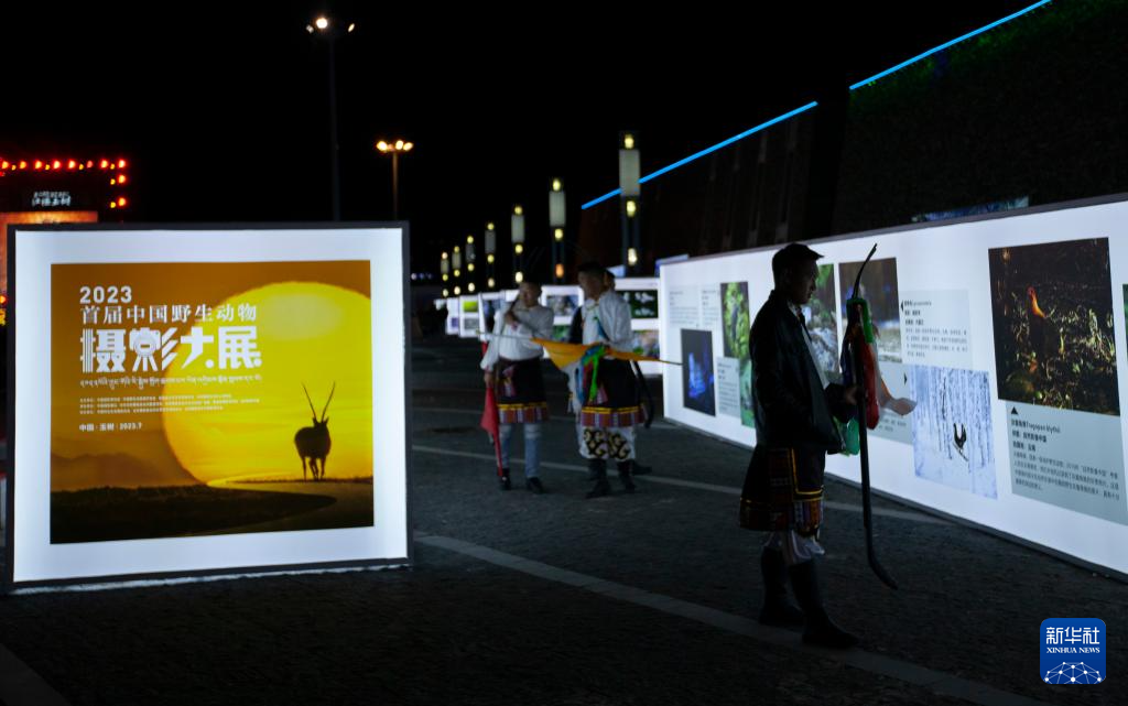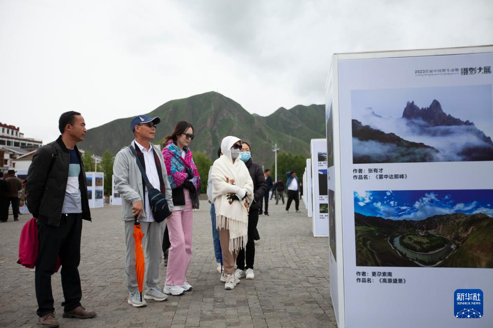 7月23日,人们在青海玉树格萨尔广场参观2023首届中国野生动物摄影大展预展。