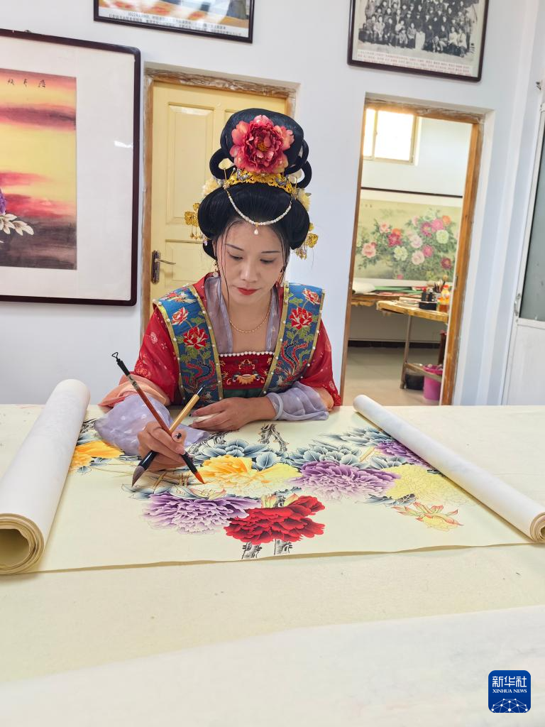 7月24日,画师在山东省巨野县书画院绘制工笔画作品。