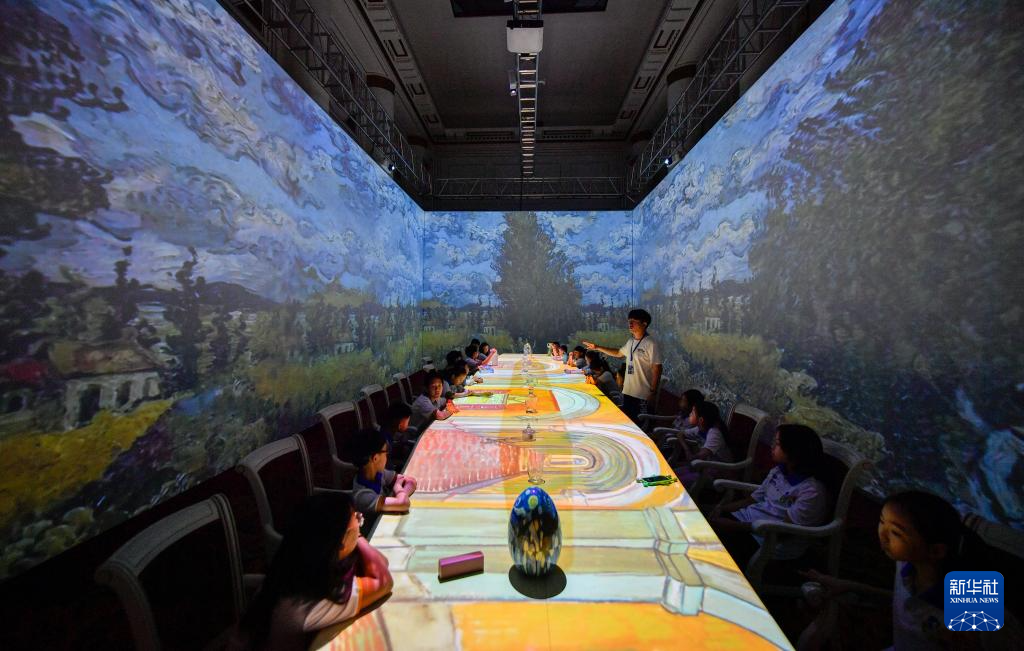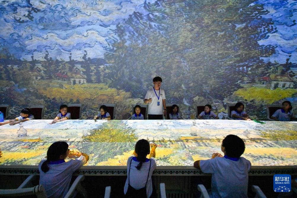 7月30日,在天津数字艺术博物馆,学生们沉浸式参观艺术作品。