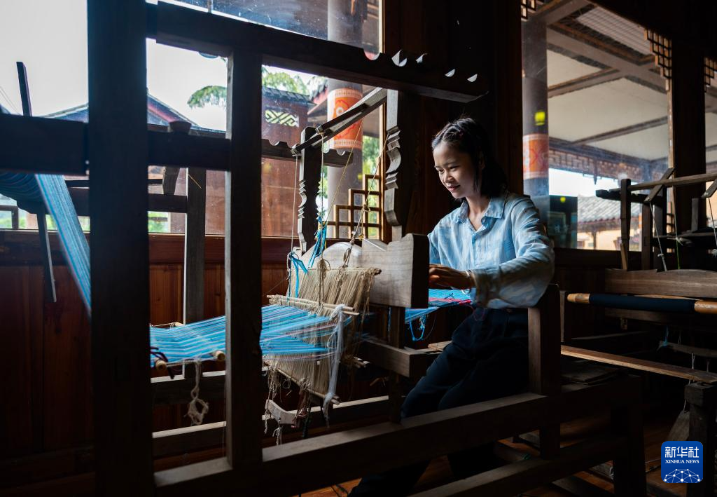 7月30日,一名游客在坡芽村坡芽传习馆内体验壮族织布。