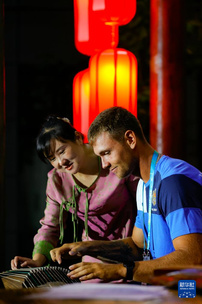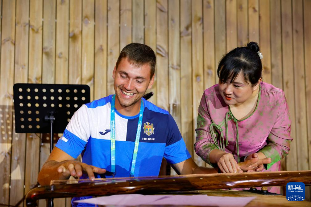 7月31日,在成都大运村,四川音乐学院中华传统音乐研究院研究员王婷在教摩尔多瓦运动员亚历山大·布洛特体验古琴演奏技法。