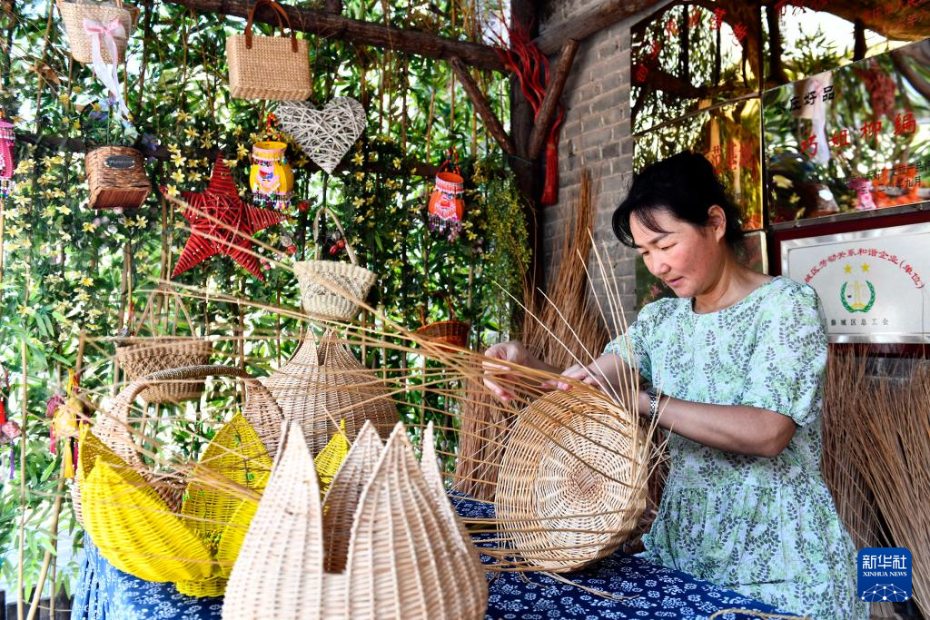 8月10日,在枣庄市薛城区柳编非遗工坊,非遗传承人赵秀梅在制作柳编。