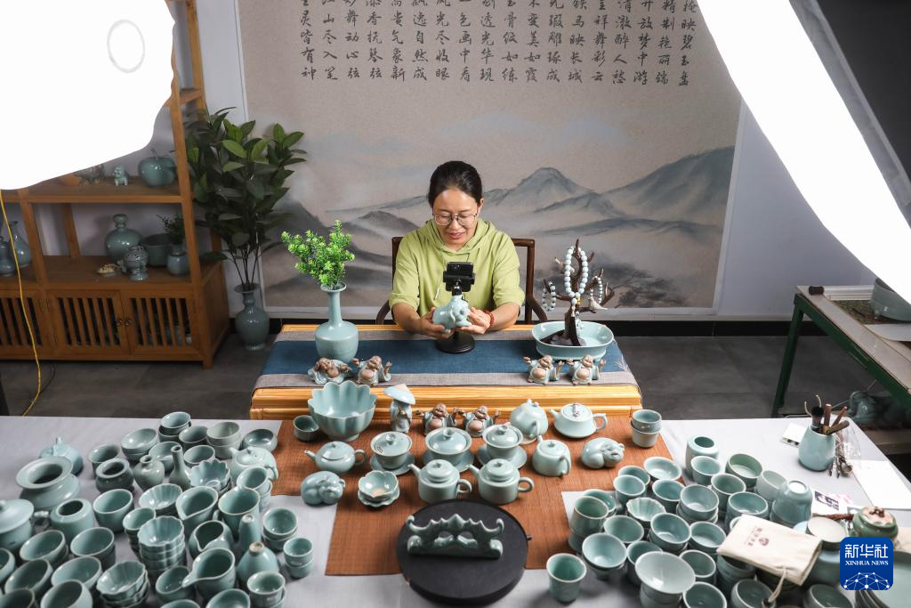 8月16日,工作人员通过网络直播推介汝瓷文创产品。