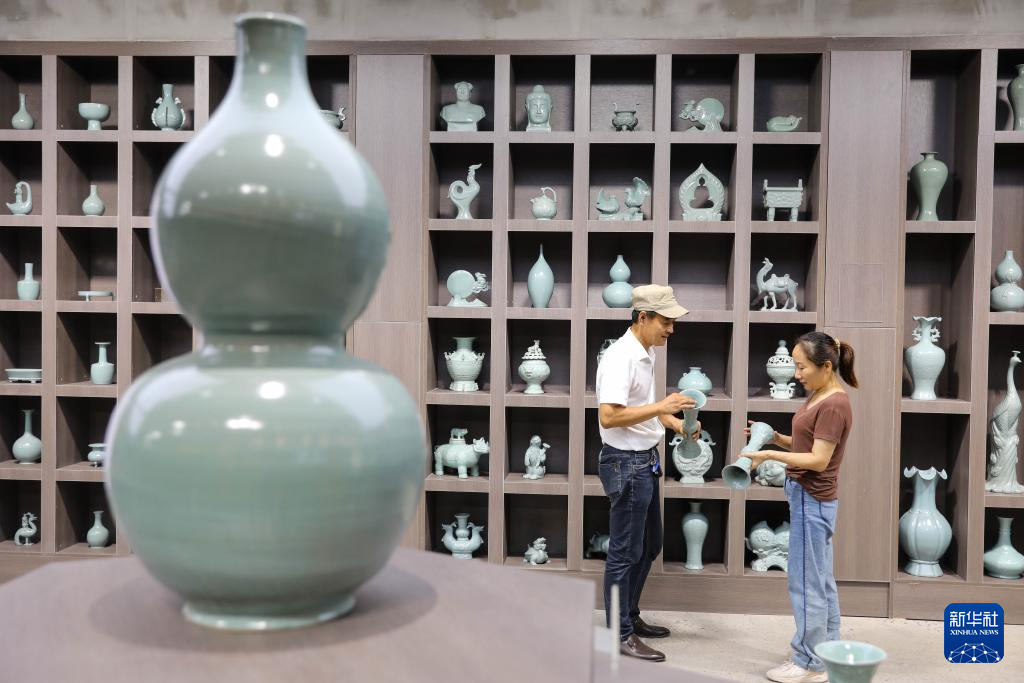 8月16日,在宝丰县张八桥镇,工作人员在展厅内摆放汝瓷文创产品。
