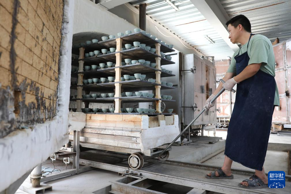8月16日,在宝丰县张八桥镇,工作人员从窑炉中拉出刚烧成的汝瓷产品。