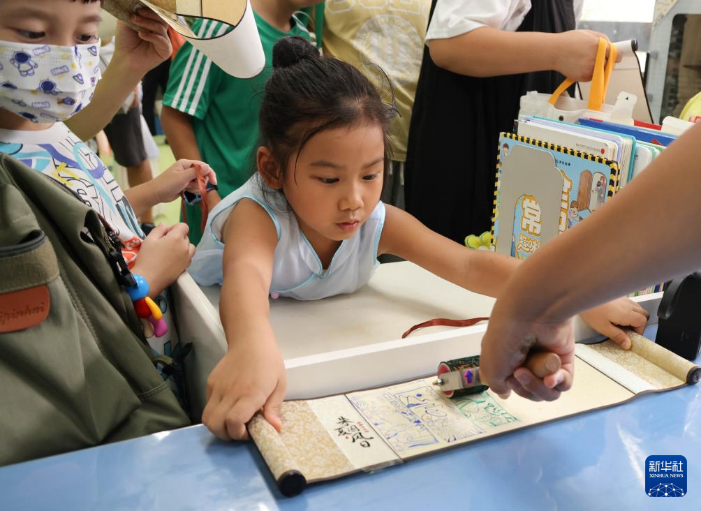 8月20日,在“朱夏国风日”传统文化沉浸式体验活动中,国家图书馆工作人员为孩子们制作国风卷轴。