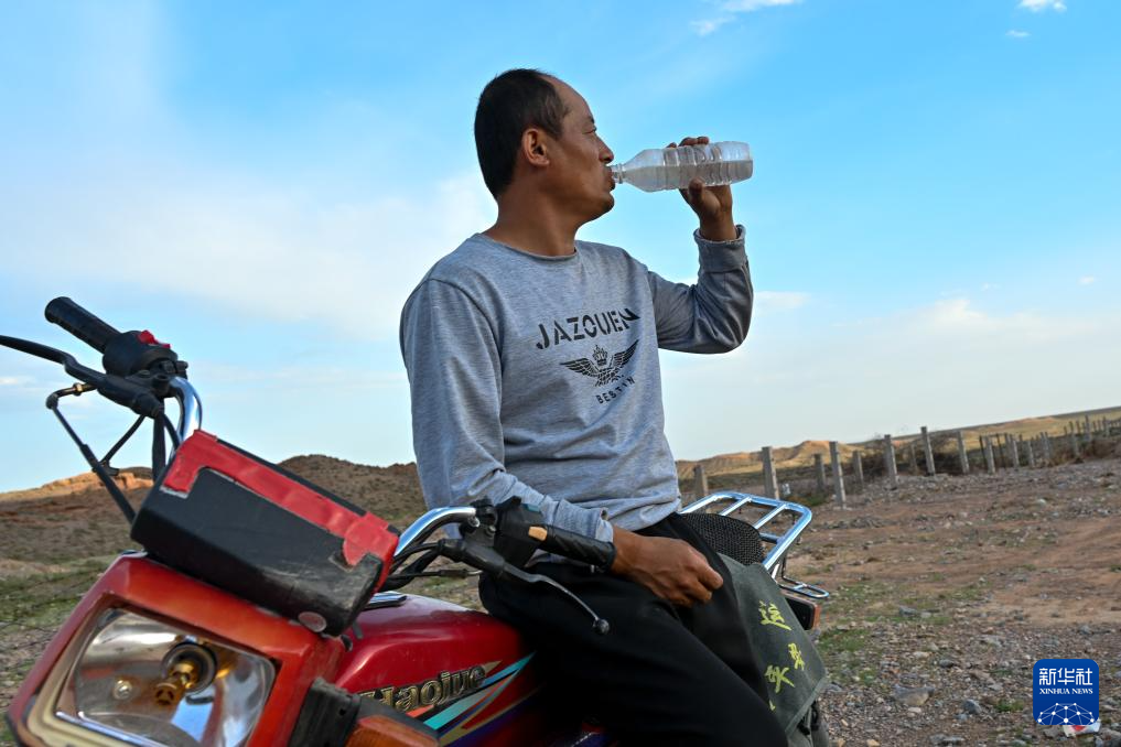 8月20日,董海宁在巡查途中喝水。
