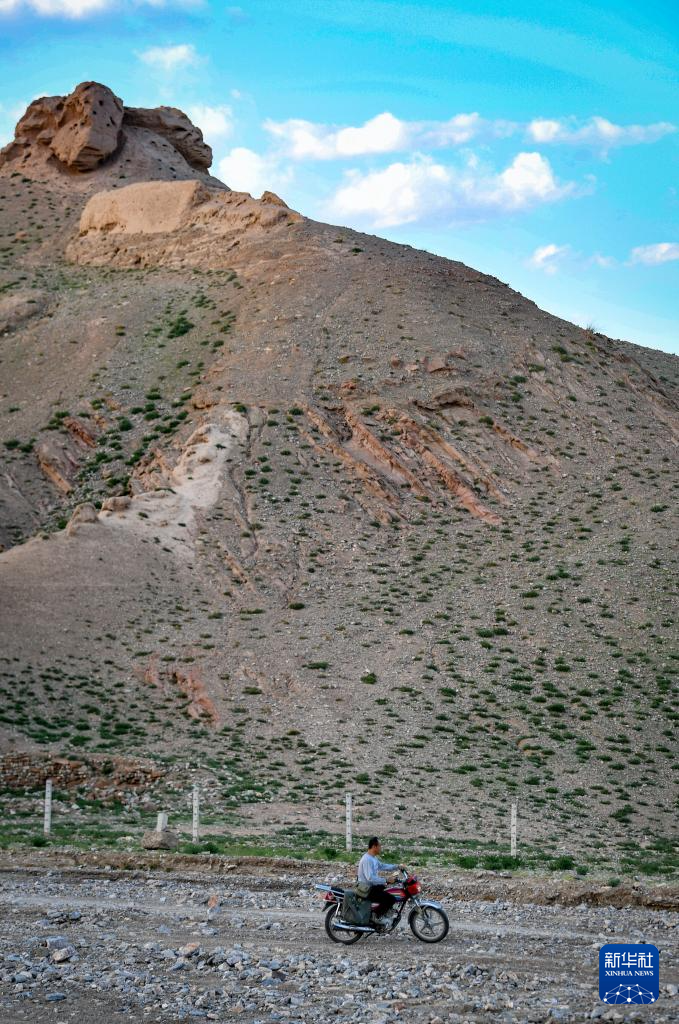 8月20日,董海宁骑摩托车巡查贺兰山沿线的明长城永宁段,利用望远镜观察远处长城情况。