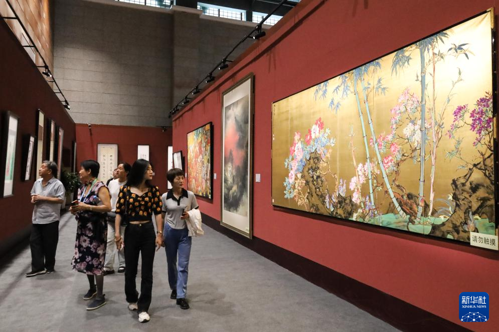 9月7日,观众在第六届丝绸之路(敦煌)国际文化博览会上参观丝绸之路绘画艺术精品展。