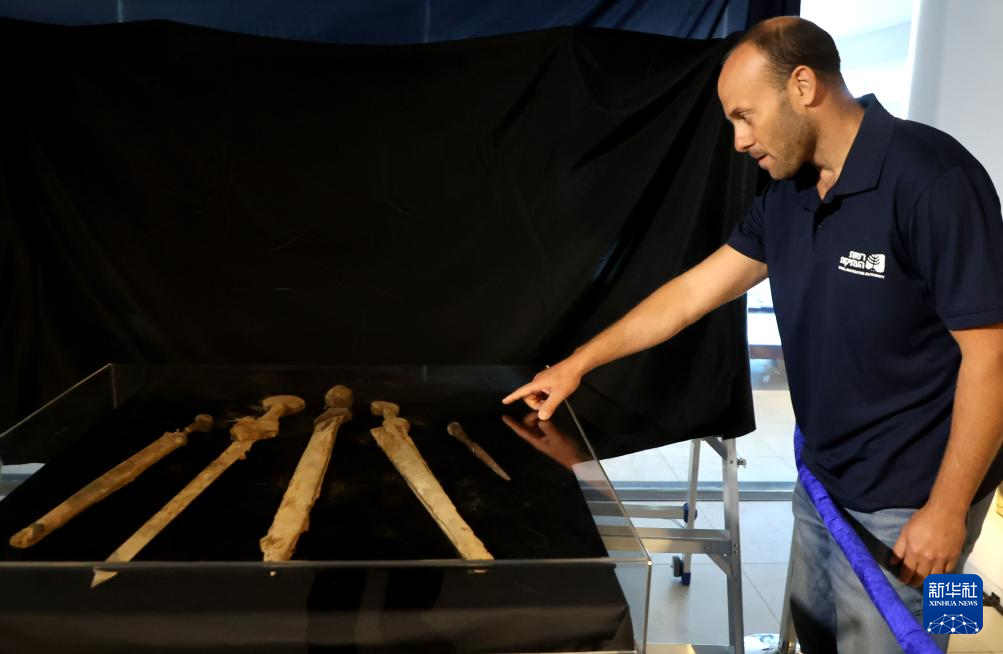 这是9月6日在耶路撒冷举行的新闻发布会上拍摄的新发现的古罗马时代兵器。