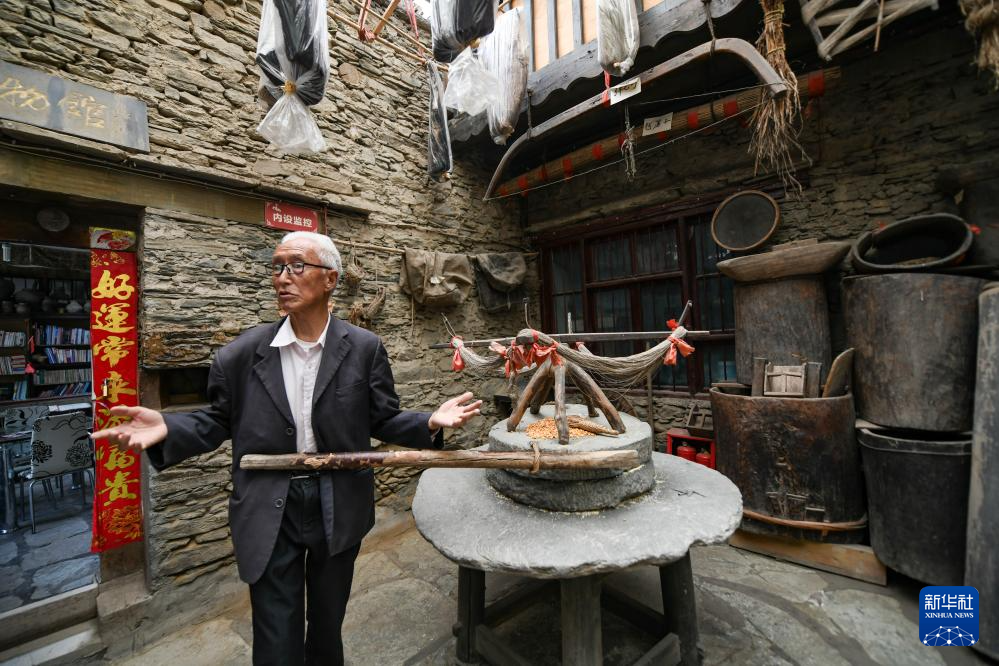 创办“桃坪羌族文化博物馆”的王嘉俊老人在演示羌族“腰磨”的用法(9月13日摄)。