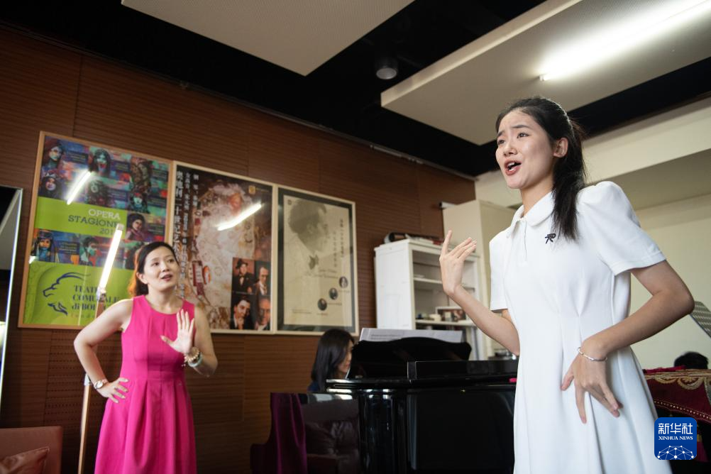 9月14日,中央音乐学院声歌系教授宋元明(左)指导女高音专业的学生练习小约翰·施特劳斯的《蝙蝠》选段。