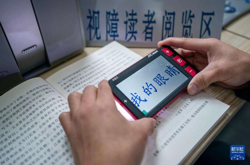 10月15日,一名视障人士在云南省图书馆视障阅览室内使用助视器辅助阅读。