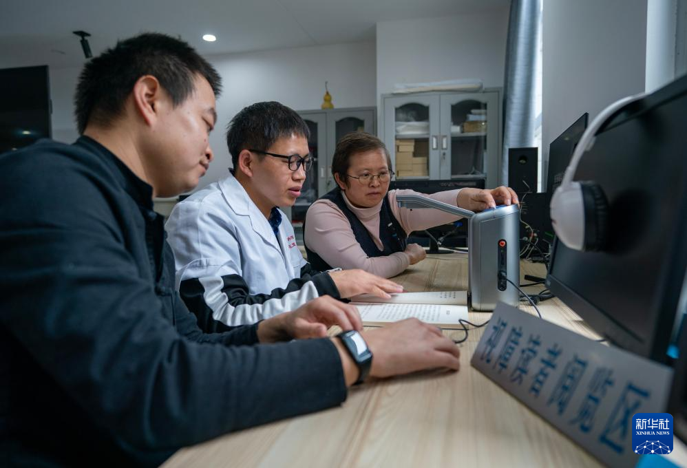 10月15日,云南省图书馆视障阅览室工作人员杨云峰(左二)指导两名视障人士使用纸质图书智能阅读器。