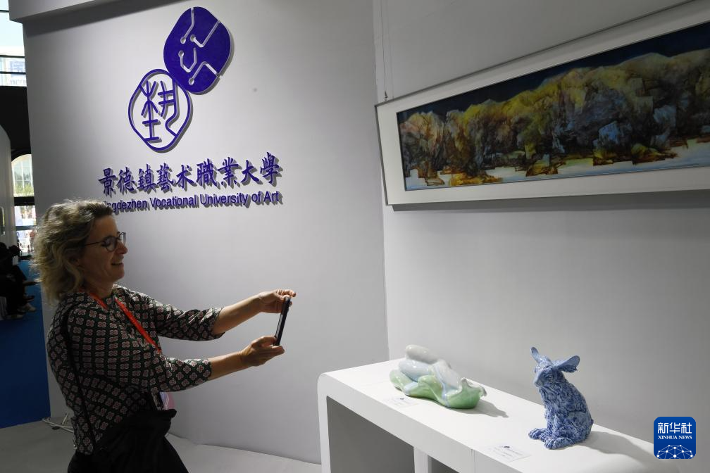 10月18日,一名外国参观者在瓷博会高校展区拍摄陶瓷艺术品。
