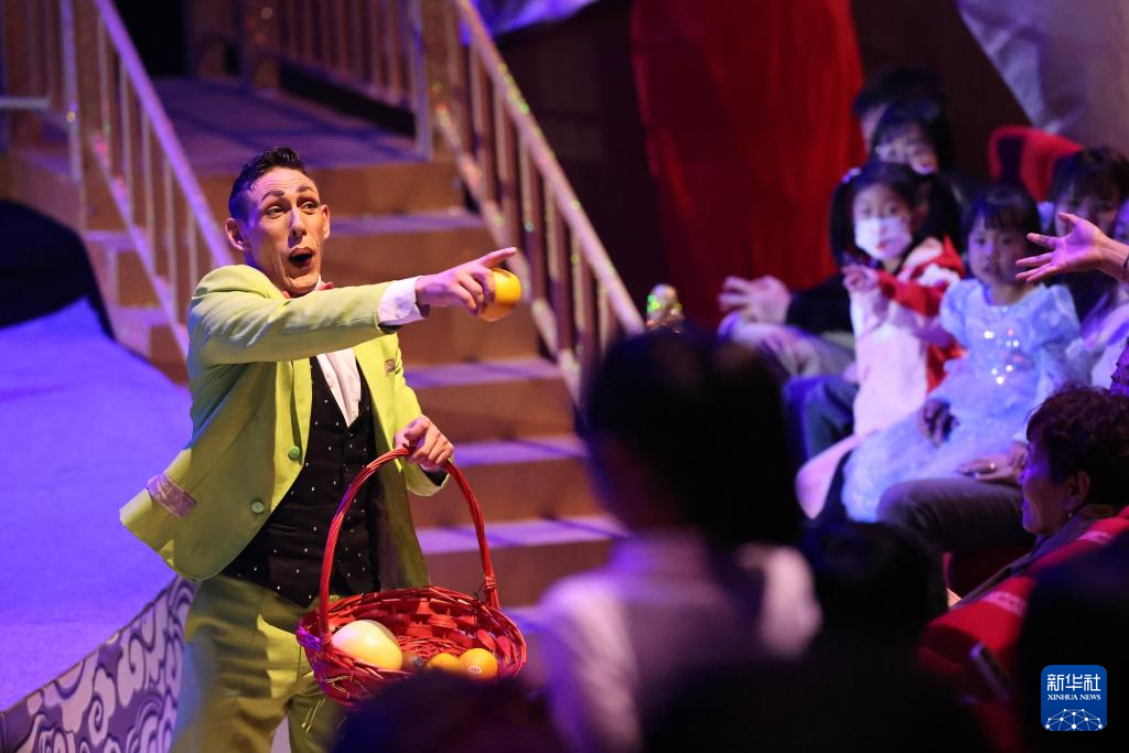 10月28日,演员在河北省沧州市吴桥县吴桥杂技大世界景区江湖大剧院与观众互动。