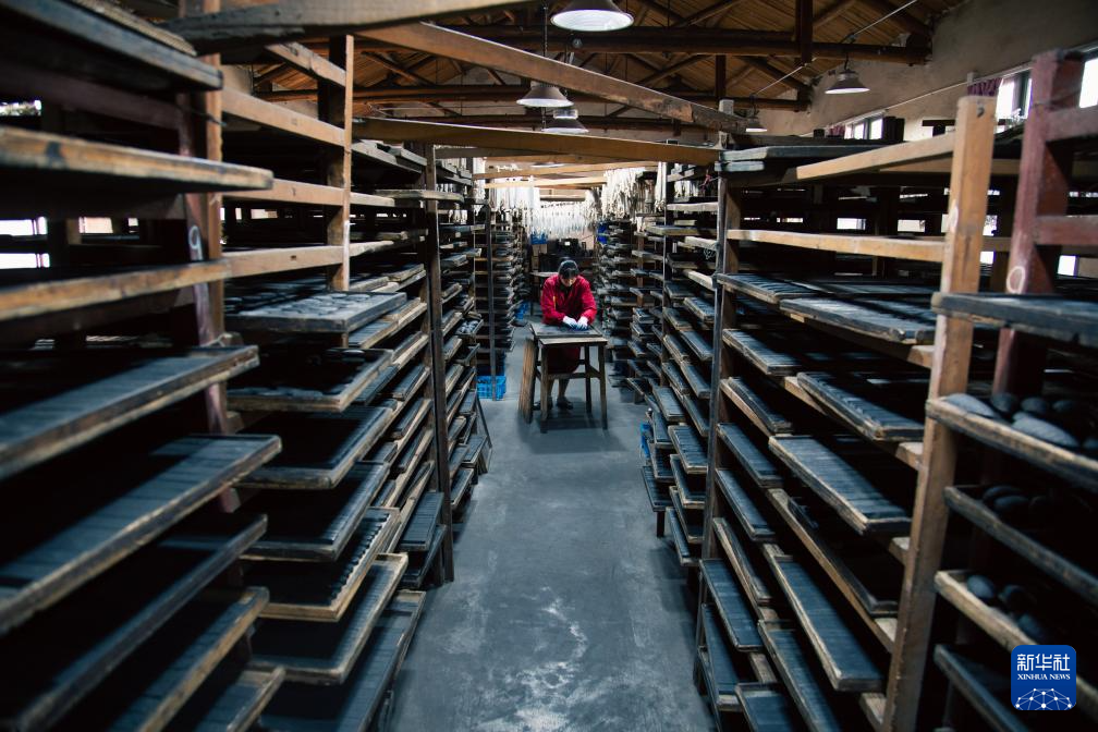 10月24日,在安徽省黄山市歙县老胡开文墨业有限公司,工人在晾墨车间查看通风晾制的墨。