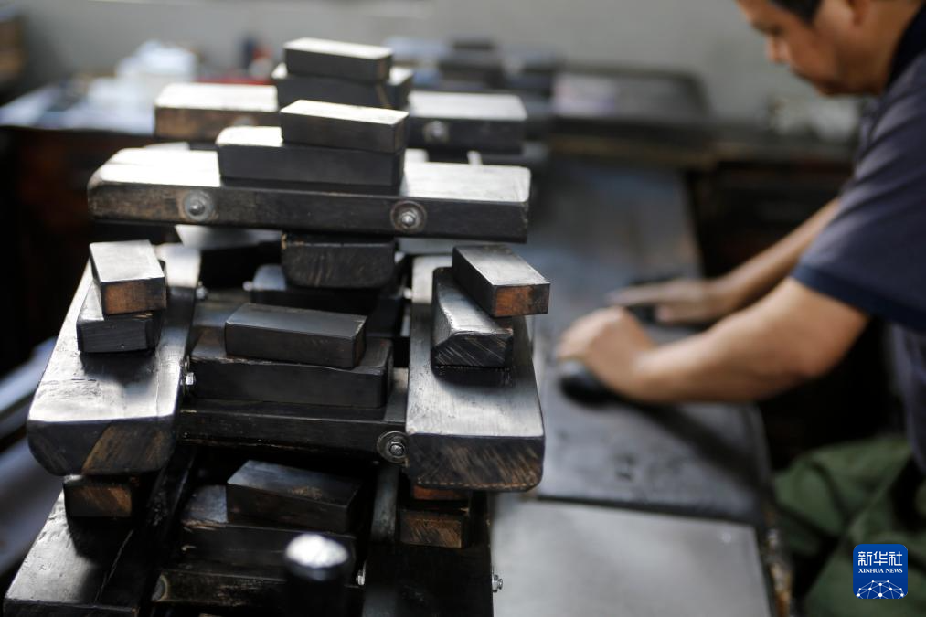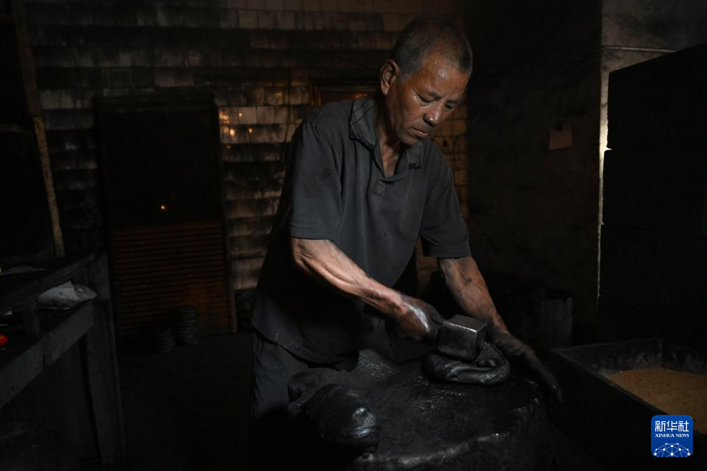 10月25日,在安徽省黄山市歙县老胡开文墨业有限公司,工人将骨胶与烟灰混合后的墨泥锤打成墨饼。