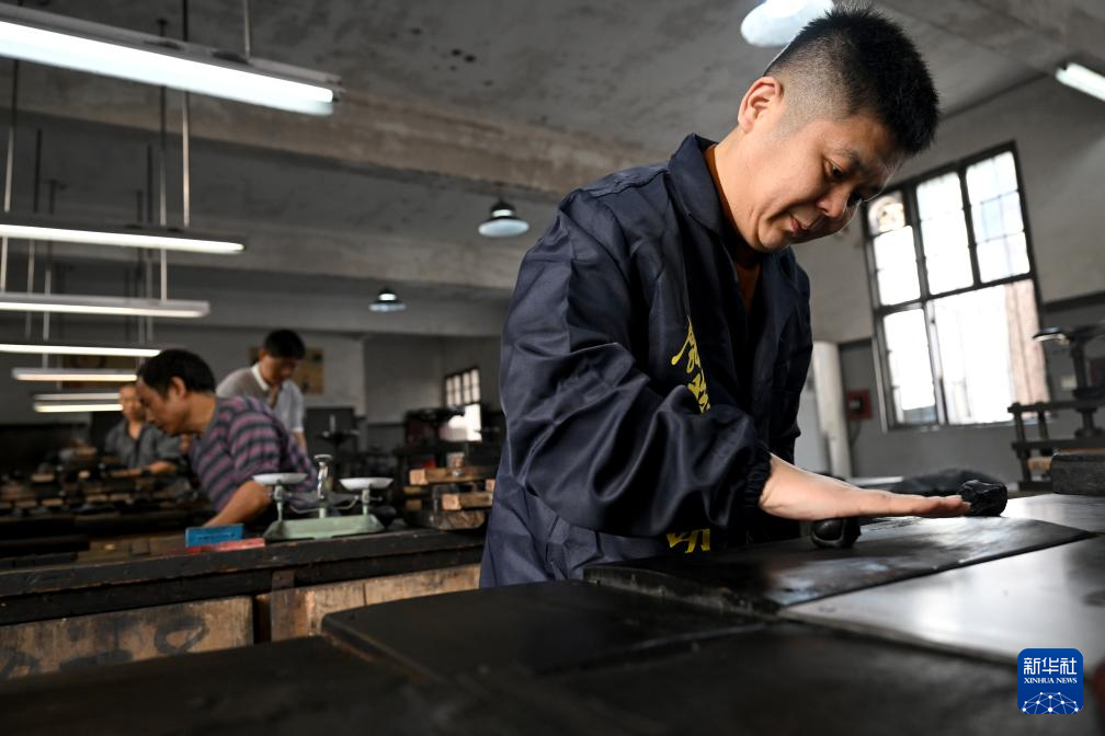 10月24日,在安徽省黄山市歙县老胡开文墨业有限公司,工人在制墨。