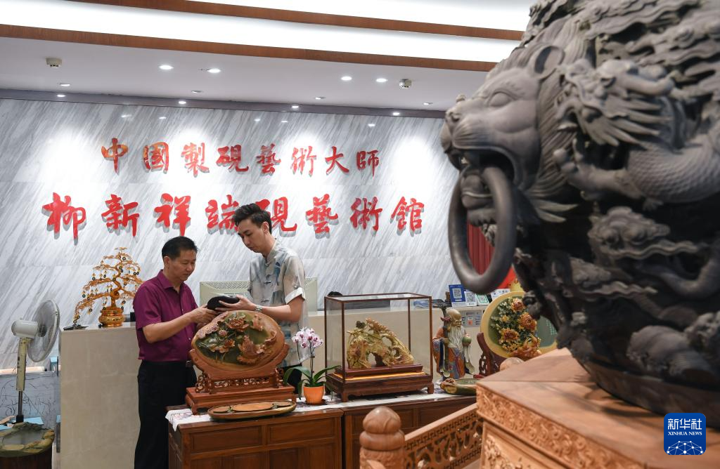10月26日,在广东肇庆柳新祥端砚艺术馆,柳新祥(左)和儿子柳飞在讨论端砚作品。