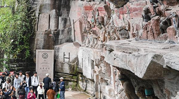 这是10月16日在斯洛文尼亚卢布尔雅那的民族志博物馆拍摄的中国古建筑木质大门模型上的钉子。