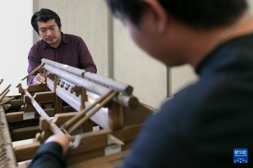 10月16日,在斯洛文尼亚卢布尔雅那的民族志博物馆,故宫博物院专家侯腾龙(左)、黄齐成修复中国古建筑室内装饰。