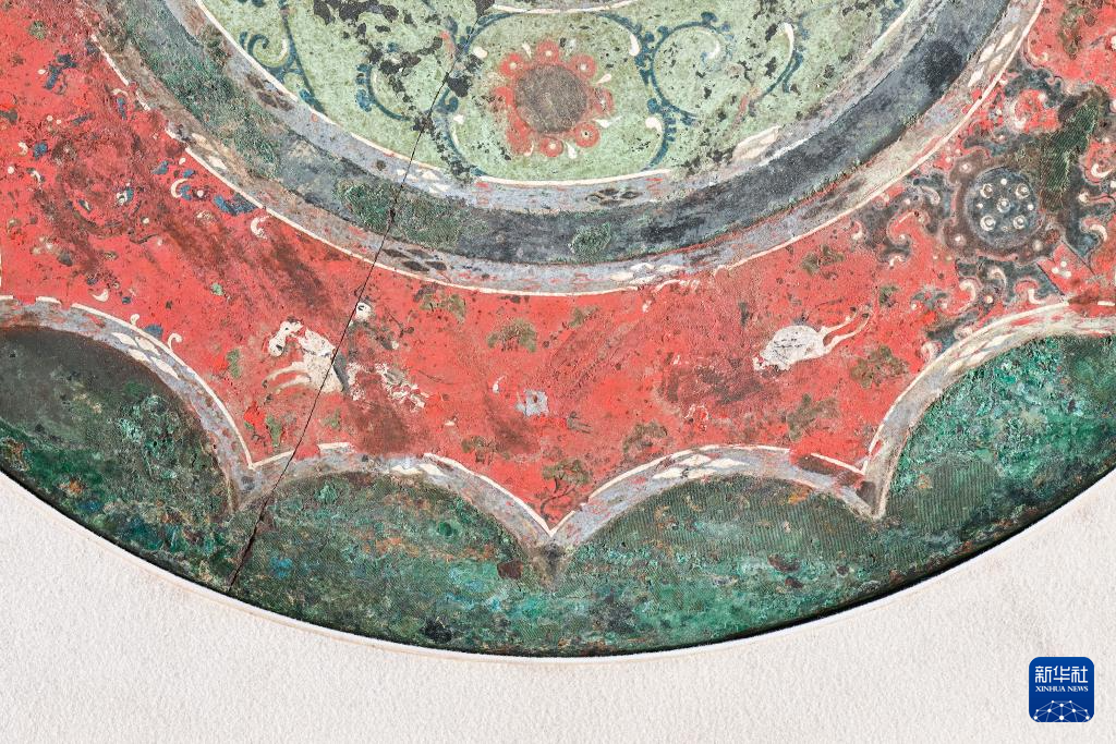 西汉彩绘人物车马镜局部彩绘图案“狩猎”(8月25日摄)。