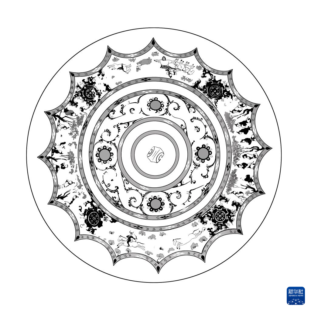 外区:红色地彩上被四个圆形纹饰分成四区,每个区隔内都绘有若干人物,展现贵族生活场景。经专家研读,四个区域按顺序可确定为出行、谒见、狩猎、宴饮四个题材。