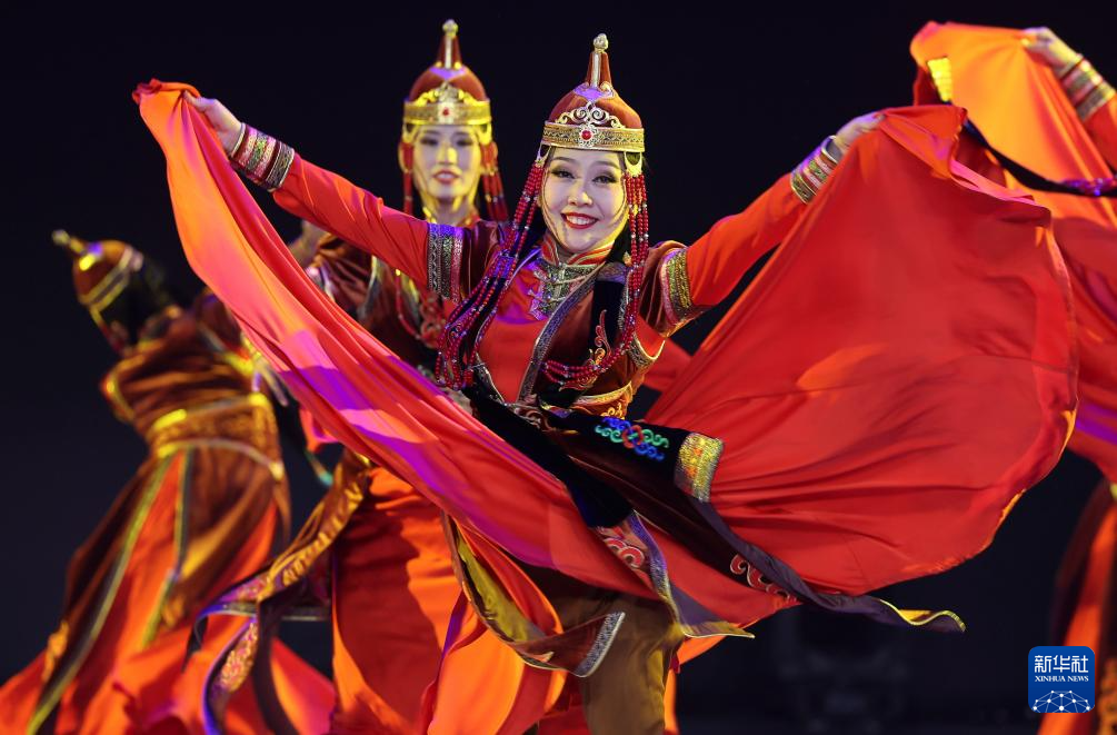 11月19日,新疆巴音郭楞蒙古自治州歌舞团演员表演作品《牧野神韵》。