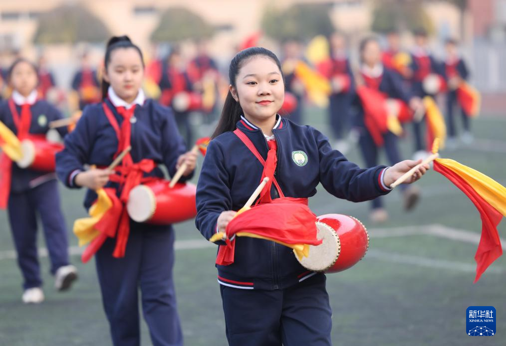 11月22日,河北省霸州市胜芳镇红光小学的学生在表演腰鼓。