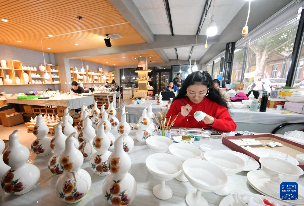 11月21日,一位工艺美术师在唐山市开平区陶瓷文创产业园创作陶瓷绘画作品。