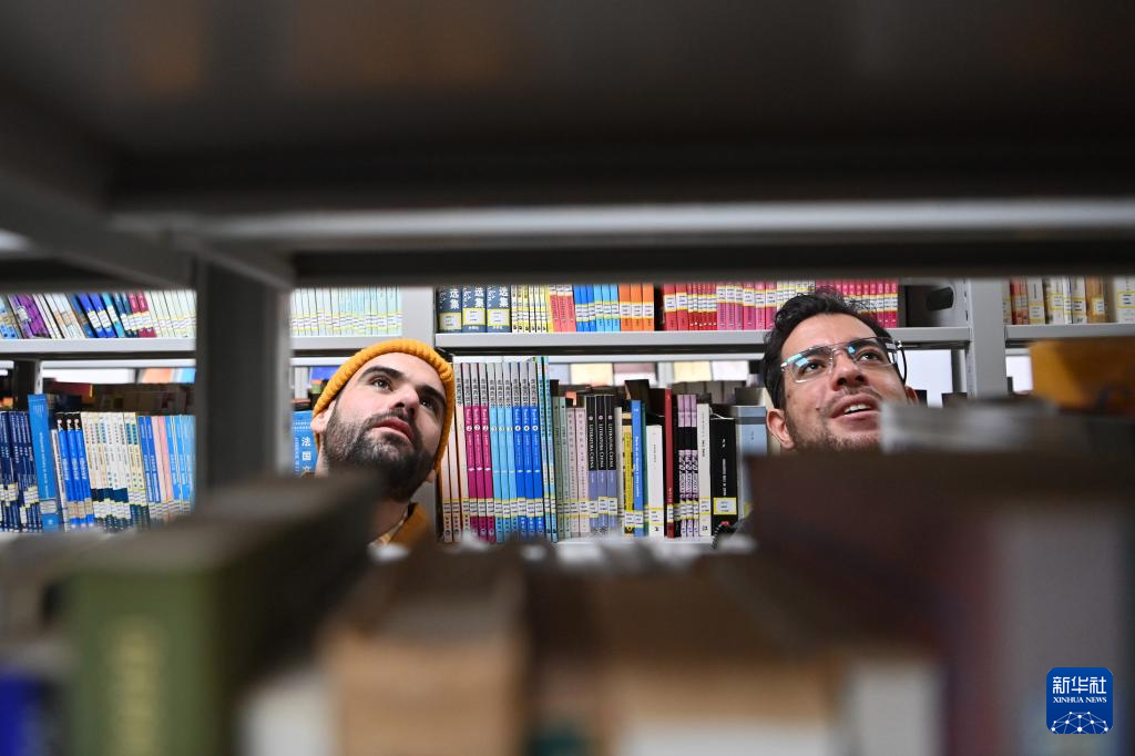 墨麒麟(左)和吴瑞龙(右)在南开大学外国语学院学术资源中心查找书籍(12月6日摄)。